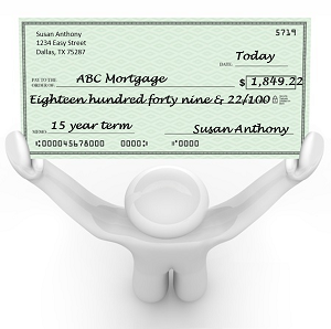 The 15 year mortgage would have payments of $1,849.22 each month with the first payment having $1,015.89 being applied to the principal. The $665.68 difference in payments goes toward reducing the loan amount and acts like a forced savings.